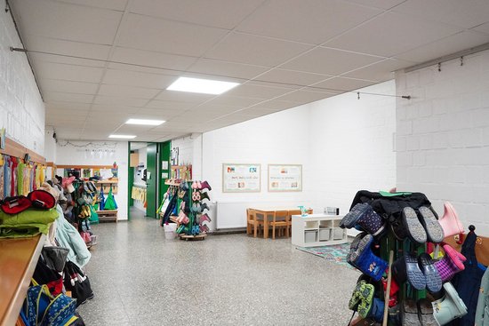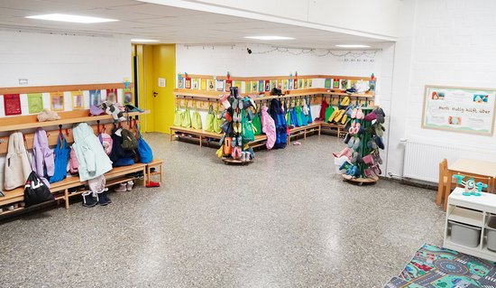 Das Gebäude ist in eine Hanganlage gebaut und somit in zwei Etagen unterteilt. Vom Haupteingang gelangt man in die obere Etage. Hier stehen den Kindern eine große Turnhalle, ein Mehrzweckraum, sowie ein großer Flurbereich, welcher für verschiedene Angebote genutzt werden kann, zur Verfügung. Neben den Räumlichkeiten für die Kinder, befindet sich auf dieser Etage auch das Büro.