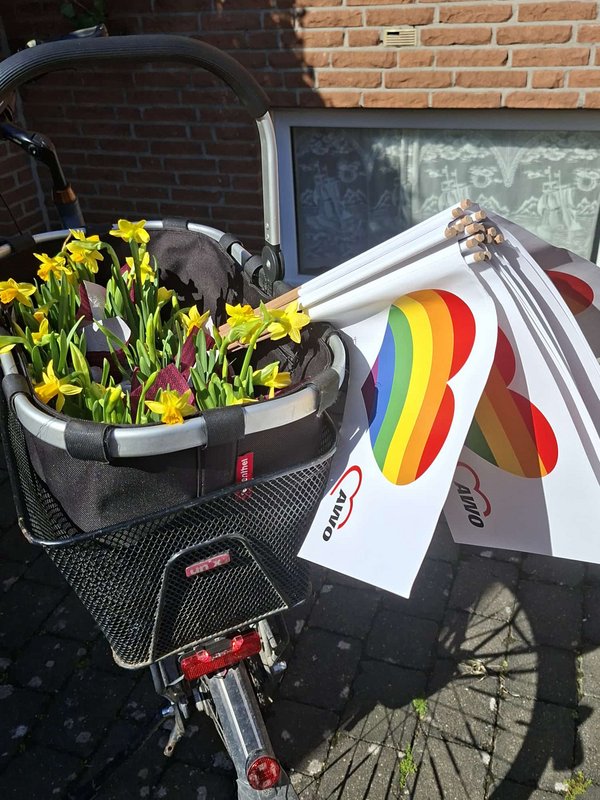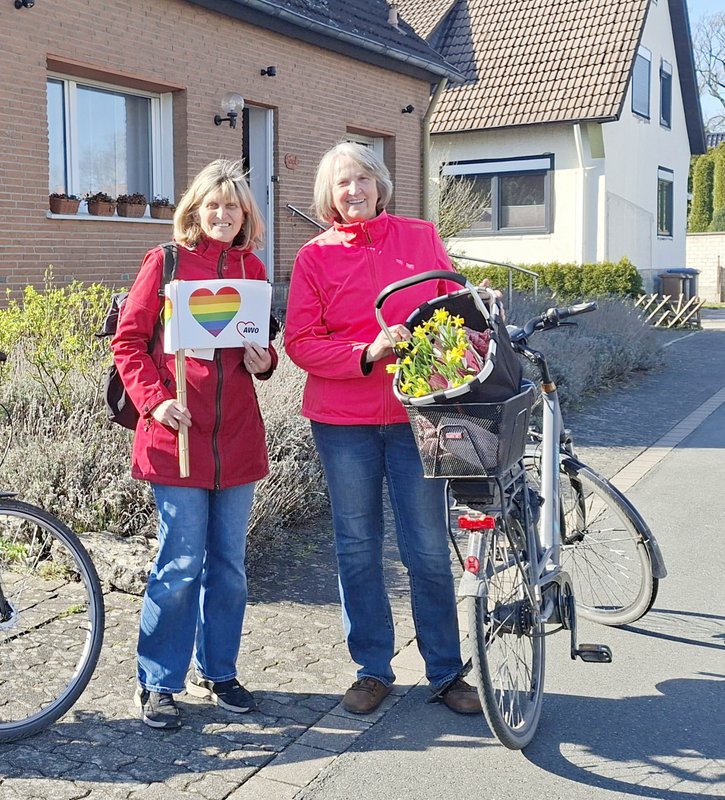 Wieder trafen Gudrun und Bea auf erfreute AWO Mitglieder im Alter 75+, die sie mit farbenfrohen Frühlingsblumen und bunten AWO-Fahnen überraschten.