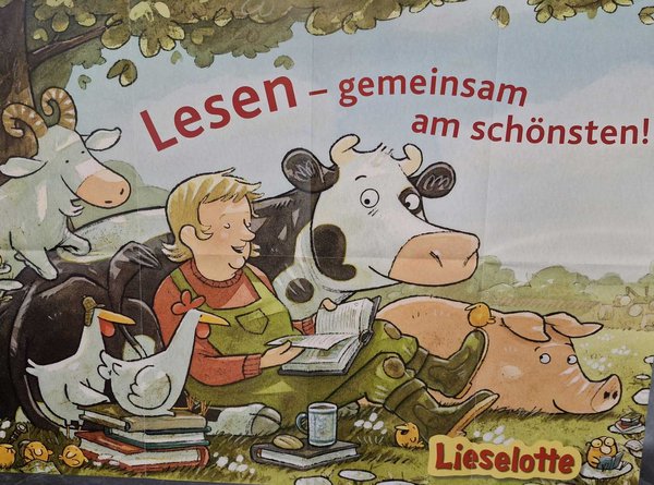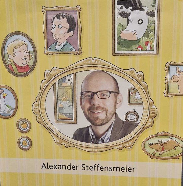 Zu Beginn wurde gemeinsam eines der Lieselotte-Bücher gelesen. Die Kinder lauschten aufmerksam der humorvollen Geschichte rund um die neugierige Kuh, die seit Jahren viele Kinder begeistert. Im Anschluss zeigte Alexander Steffensmeier, wie er seine Bücher illustriert. Auf einer großen Zeichenfläche entstanden live vor den Augen der Kinder Zeichnungen von Lieselotte, einem Huhn, einem Schwein und dem Bauern – ganz so, wie man sie aus den Büchern kennt.