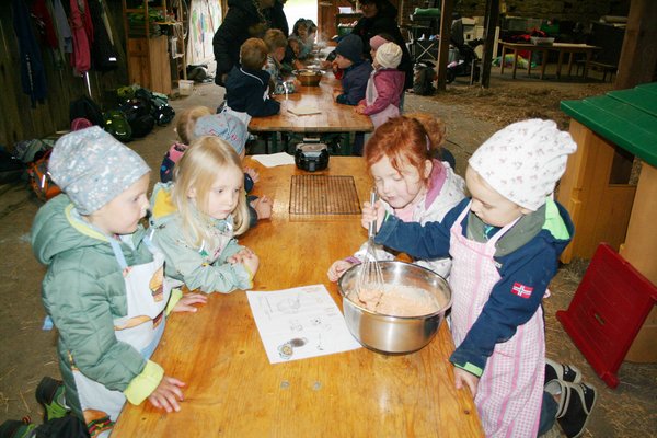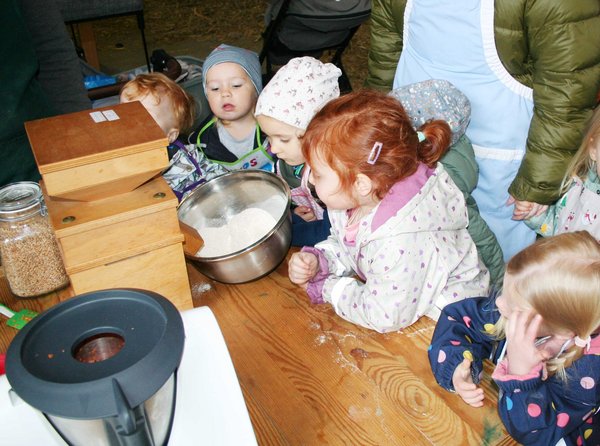 Zur Mittagszeit verwandelte sich die Spielscheune in eine kleine Landküche: In drei Teams bereiteten die Kinder einen frischen Waffelteig zu – mit selbstgesammelten Eiern, frisch gemahlenem Mehl und den zuvor geernteten Möhren. Mit viel Freude und großem Einsatz wurde gebacken – und natürlich auch direkt vernascht. Die Waffeln schmeckten allen köstlich.