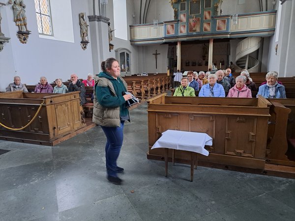 Franziska Erling hatte sich viel Mühe gegeben und berichte einige markante Merkmale über die katholische Kirche. Diese prägt mit ihrem hohen Turm das Ortsbild und ist weit über die Ortsgrenzen sichtbar. Sie steht auf dem höchsten Punkt des historischen Dorfkerns, dazu ist zu bemerken, dass Kallenhardt bis 1870 Stadtrechte besaß.