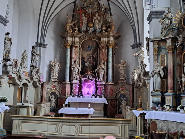 Im Inneren beeindruckt die Kirche mit kunstvollen Altären, einer barocken Kanzel, alten Beichtstühlen und einer Orgel aus dem 18. Jahrhundert.