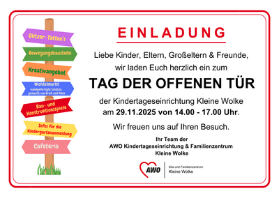 Am Samstag, den 29.11.2025 findet von 14.00 bis 17.00 Uhr in der AWO Kita & Familienzentrum „Kleine Wolke“, Schwester-Luziana-Str. 16 in Meschede ein „Tag der offenen Tür“ statt.